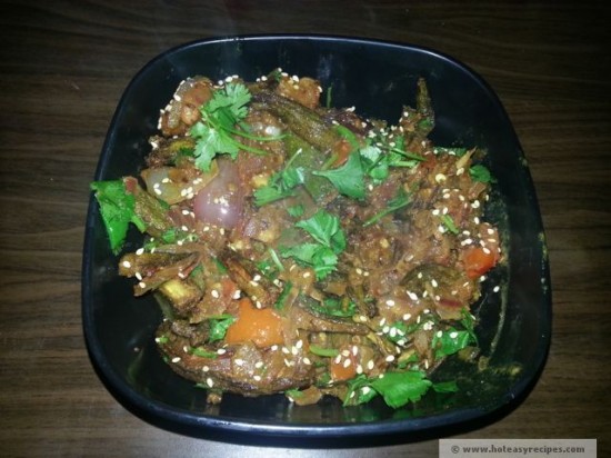 - लीजिये आपकी भिन्डी दो प्याज तैयार है, एक प्याले में निकाल कर, ऊपर से तिल डालकर गरमा गरम सर्व करे।