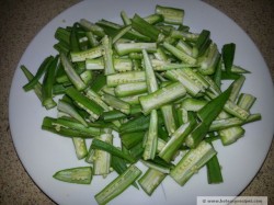 - भिन्डी को काटने से पहले अच्छे से धोकर साफ़ कपडे से पोछ ले ताकि पानी न रह जाए। अब जब पानी बिलकुल सूख जाए तब भिन्डी को काट ले। भिन्डी को 4 या फिर 6 भागो में काट ले जैसा की फोट में दिखाया है।