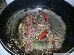 - पैन में थोड़ा सा तेल गरम करे, तेल गरम होने पर जीरा, कटी हुई हरी मिर्च और अदरक डाल दे। 1 मिनट के लिए भुने और फिर इस में कटा हुआ प्याज डाल कर हल्का ब्राउन होने तक भून ले।