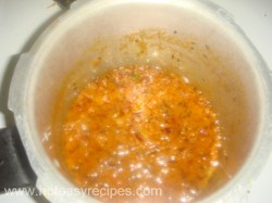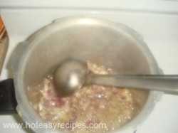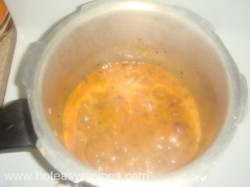 - अब हम कूकर में 2 बडे स्पून तेल डालेगे, जब तेल गरम हो जाये तब इस में जीरा और हींग डाले. अब इस में कटा हुआ प्याज और हरी मिर्च डाल दे और हल्का गुलाबी होने तक भूने. जब प्याज भुन जाए तब इस में टमाटर की प्यूरी और सारे मसाले (हल्दी, लाल मिर्च, धनिया पाउडर, गरम मसाला और नमक) डाल दे और धीमी गैस पर इसे पकने दे.