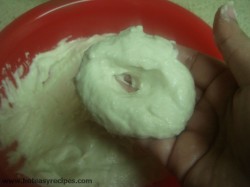 - अब पीसी हुई दाल में नमक और हींग मिला दे. और हाथ से दाल को अच्छे से फेट ले.(दाल को खूब अच्छे से फेटे. जब दाल का रंग हलके पीले से सफ़ेद हो जाए तो समझ जाइये की दाल फिट गयी है) ध्यान रहे दाल को खूब अच्छे से फेटे तभी आपके बड़े मुलायम बनेगे.