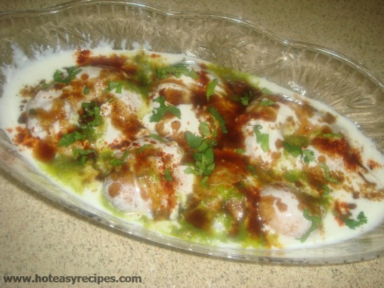 - अब बडो के ऊपर सारा दही डाल दे. दही इतना होना चाहिए की सारे बड़े डूब जाए (*बड़े दही बहुत सोखते है इसलिए दही थोड़ा ज्यादा ही रखे) अब इसके ऊपर इमली की चटनी , धनिये की चटनी, नमक, लाल मिर्च, जीरा पाउडर डाल दे. और ऊपर से कटा हुआ हर धनिया डाल कर सजा दे. अब इसे उठा कर इसे फ्रिज में रख दे. कम से कम इसे खाने से एक घंटा पहले बना कर फ्रिज में रख दे ताकी खाने के वक्त तक बड़े दही अच्छे से सोख ले.