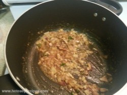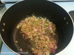 - अब जिस पैन में ब्रेड फ्राई करी है, उस में तेल या बटर डाले, जब वो गरम हो जाए तब उस में थोडा सा जीरा डाल दे. जब जीरा चटकने लगे तब इस में कटा हुआ प्याज और हरी मिर्च डाल दे. अब प्याज को transparent होने तक भून ले, ध्यान रहे प्याज को ज्यादा न भुने यानी की प्याज को ब्राउन नहीं करना है.अब प्याज में अदरक-लहसुनका पेस्ट या फिर कटी हुई अदरक डाल दे.