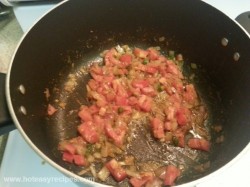 - 1-2 मिनट इसे भुने और फिर इस में कटे हुए टमाटर डाल दे. अब इसे ढक कर 1-2 मिनट तक रखे ताकि टमाटर गल जाए, जब टमाटर गल जाए तब इस में सारे मसाले (धनिया पाउडर, लाल मिर्च पाउडर, हल्दी और नमक) डाल दे, नमक देख कर डाले क्युकी अपने जो एग फेटा है उस में भी नमक डाला हुआ है.