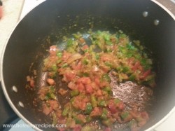 - अब जब टमाटर और मसालों में से तेल अलग होने लगे तो समझ लीजिये की मसाले भुन गए है, अब अगर आपको कोई सब्जी डालनी है तो अब डाल दे, और उसके पकने तक उसे फ्राई कर ले. आपका जितना मन हो उतना ही सब्जी को पकाए, जैसे शिमला मिर्च और गाजर जब हलकी सी कच्ची हो तभी अच्छी लगती है. अब इस में बारीक कटा हुआ हरा धनिया डाल ले. और अच्छे से चला ले, अगर आपको चाट मसाला पसंद है तो वो भी आप अभी डाल सकते है.