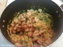 - अब इस में फेटा हुआ एग डाल दे. और तेज गैस पर इसे होने दे, और अच्छे से लगातार चलाते रहे. जब एग थोडा ड्राई हो जाए तब इस में फ्राई करी हुई ब्रेड डाल दे. (अगर आपको ब्रेड नहीं डालनी है तो रहने दे)
