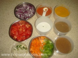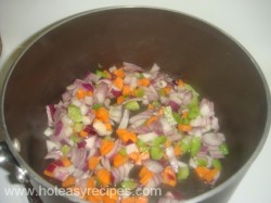 - एक पैन ले और उस में तेल डाले. जब तेल गरम हो जाए तब उस में अदरक-लहसुन का पेस्ट डाले. हल्का सा भूने और फिर टमाटर को छोड़ कर बाकी सारी कटी हुई सब्जी डाल दे. सब्जी को 4-5 मिनट तक अच्छे से भूने और फिर निकाल कर अलग रख ले.