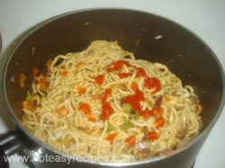 - जब मसाला तैयार हो जाए तब इस में उबले हुए मैगी नूडल्स डाल दे. अब मैगी मसाला, काली मिर्च पाउडर और चिली सौस डाले (आप चाहे तो थोड़ा सा टोमाटो सौस भी डाल सकते है) और मिलाये. अब जो सब्जी हमने फ्राई करके रखी थी उसे भी इस में मिला दे. हल्का सा नमक डाले और अच्छे से मिलाये.