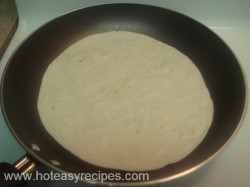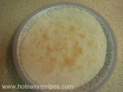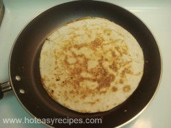 • अब आप पैन (आप तवा भी इस्तेमाल कर सकते है) ले और तेल लगा कर उसे चिकना कर ले.  गरम हो जाने पर उस में तोर्तिल्ला डाल दे और उसे एक तरफ से भूरा होने तक सेक ले.