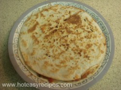 • जब वो एक तरफ से भूरा हो जाए तो उसे प्लेट पर निकाल कर रख ले. अब इसी तरह दूसरे तोर्तिल्ला को भी एक तरफ से सेक ले. जब तक वो सिकता है तब तक आप पहले तोर्तिल्ला पर पिज्ज़ा सौस लगाए (जिस तरफ से आपने सेक लिया है उस तरफ सौस लगाए).